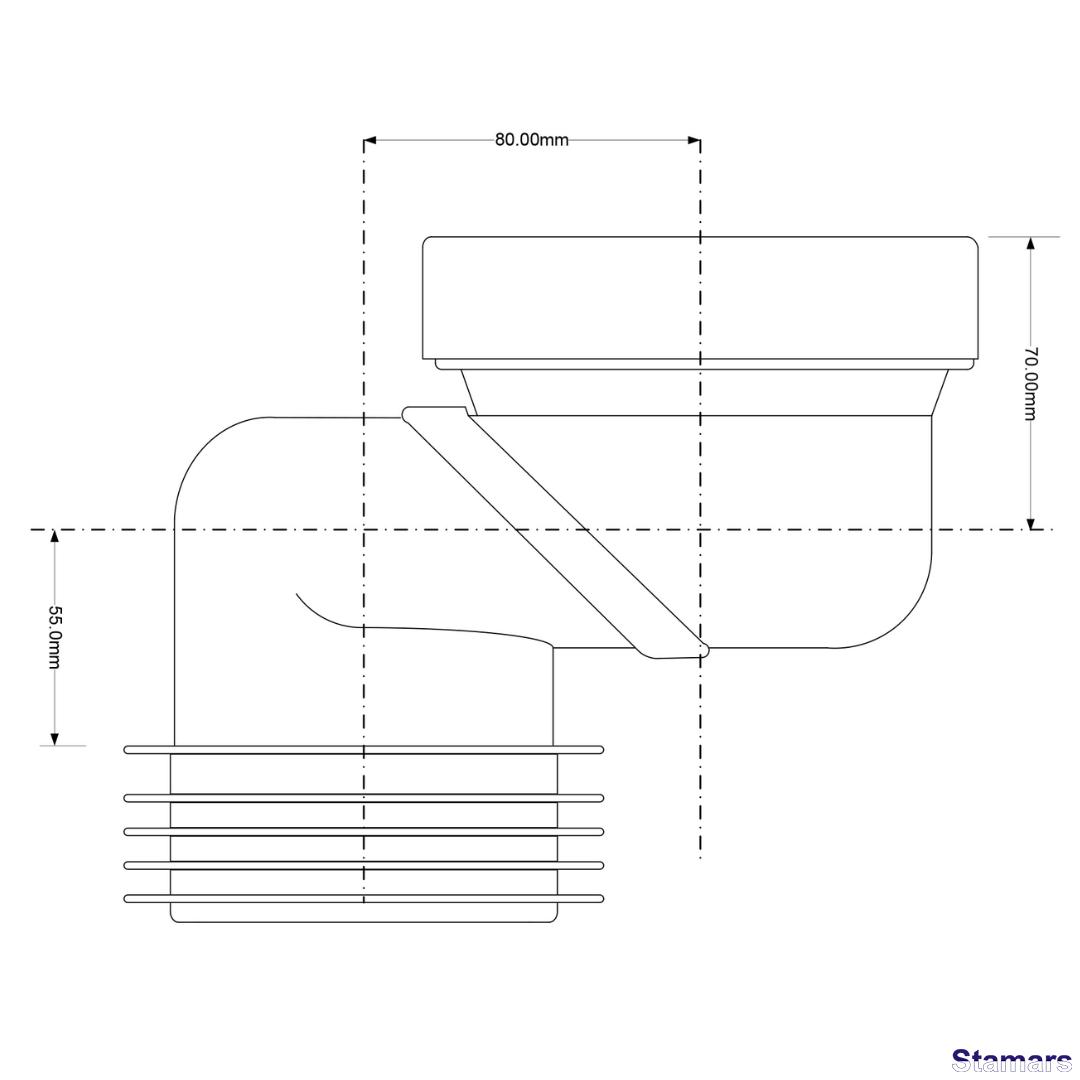 Kanalizācijas savienojums, īss (80 mm), ekscentrisks ar 80 mm nobīdi. Ieeja 90–110 mm ar lūpu blīvi, izeja 110 mm ar atloku blīvi.